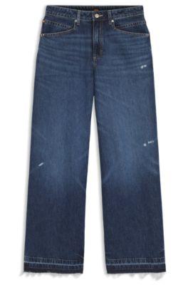 Discover timeless comfort with these BOSS women's jeans crafted from rigid denim that offers a fluid feel. Featuring a rich dark blue hue, these full-length jeans showcase a relaxed, wide-leg silhouette with a clean hemline and classic flat-front waistband. The regular waist rise and practical pockets enhance everyday wearability, making them an ideal choice for casual outings or streetwear looks. Versatile and easy to style, these jeans effortlessly blend classic denim appeal with modern relaxed comfort, perfect for elevating your casual wardrobe with understated sophistication.