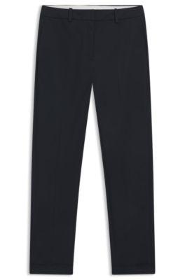 Elevate your professional attire with these stylish cropped trousers from BOSS Womenswear. Crafted from a high-quality stretch cotton twill, these dark blue pants effortlessly combine comfort and sophistication. Designed with a straight fit and tapered leg, they offer a tailored silhouette perfect for the modern woman on the go. The regular-rise waist ensures a flattering fit, making them ideal for work events or business casual outings. Pair them with a fitted blouse or a structured blazer for a polished look that transitions seamlessly from office hours to after-work gatherings.