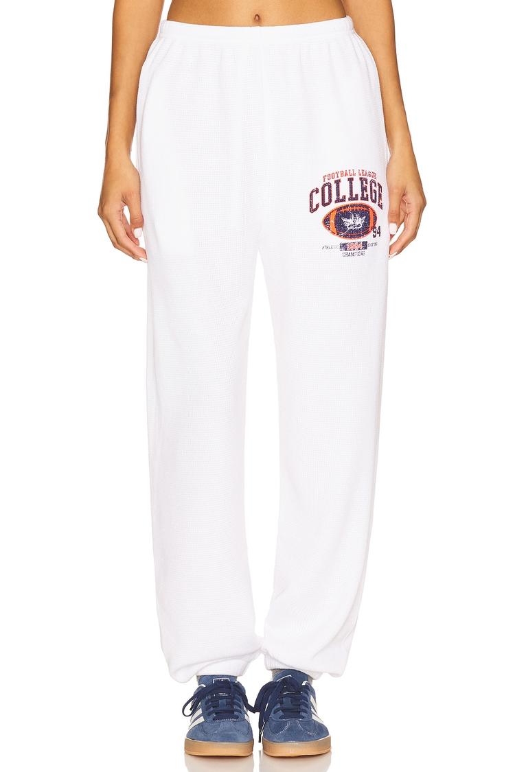 Embrace relaxed comfort with these white heavyweight waffle knit joggers designed for effortless style and all-day wear. Featuring an elasticated waistband with an interior drawstring tie for a customizable fit, these pants offer a relaxed silhouette that flows into cuffed hems. The front showcases a collegiate-inspired print in dark red and navy blue, adding a sporty touch to the modern casual look. Practical side seam pockets enhance functionality, making these joggers perfect for lounging at home, casual streetwear, or travel days. Crafted from a stretchy polyester-rayon-spandex blend, they combine durability with comfort and machine-wash convenience for easy care.