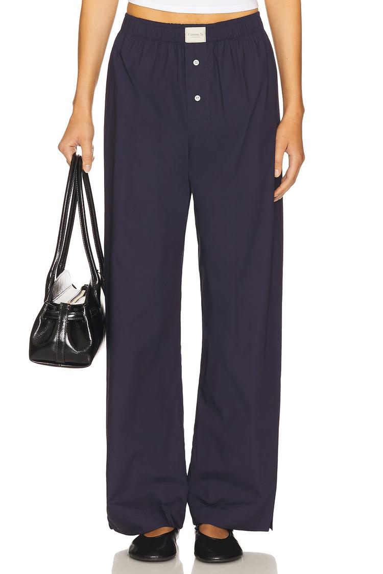 Elevate your everyday with these Navy wide-leg La Boxer Alta pants. Crafted in breathable cotton poplin, they feature a pull-on silhouette with an elasticated waistband and a neat front button closure for a polished, no-fuss fit. The deep navy drape forms a relaxed, full-length silhouette that moves with ease, pairing effortlessly with a cropped tee or a tucked-in blouse. A subtle logo at the waistband adds a modern touch of sport-luxe detail. Ideal for travel, weekends, and city days alike—style that stays effortless, versatile, and chic from morning to night.