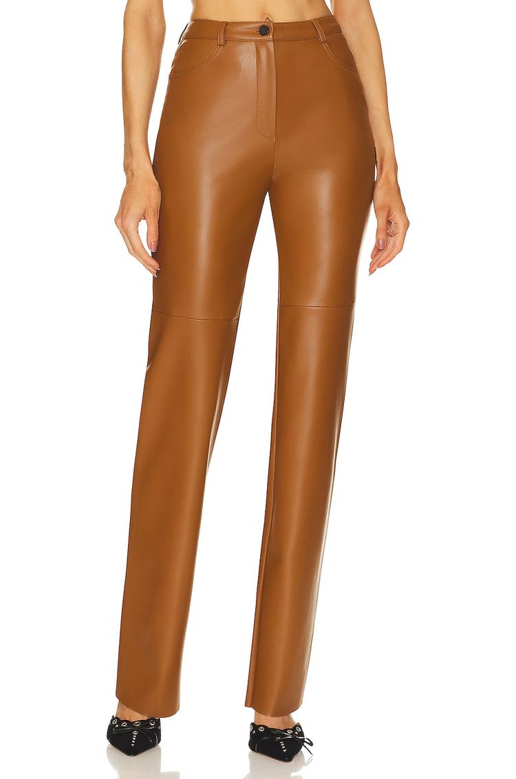 Strategic polish meets city-ready edge with these Killa Faux Leather Trousers. In a rich caramel-brown shade, the smooth faux leather brings a sleek, straight-leg silhouette that sits high on the waist with a clean flat-front waistband. A practical 4-pocket design and a zip fly with button closure complete the refined look, while a touch of elastane keeps the shape and movement smooth from desk to dinner. Pair with a structured blazer for workwear confidence, or a knit top and boots for weekend outings. Effortless chic that transitions from day to night with modern poise.