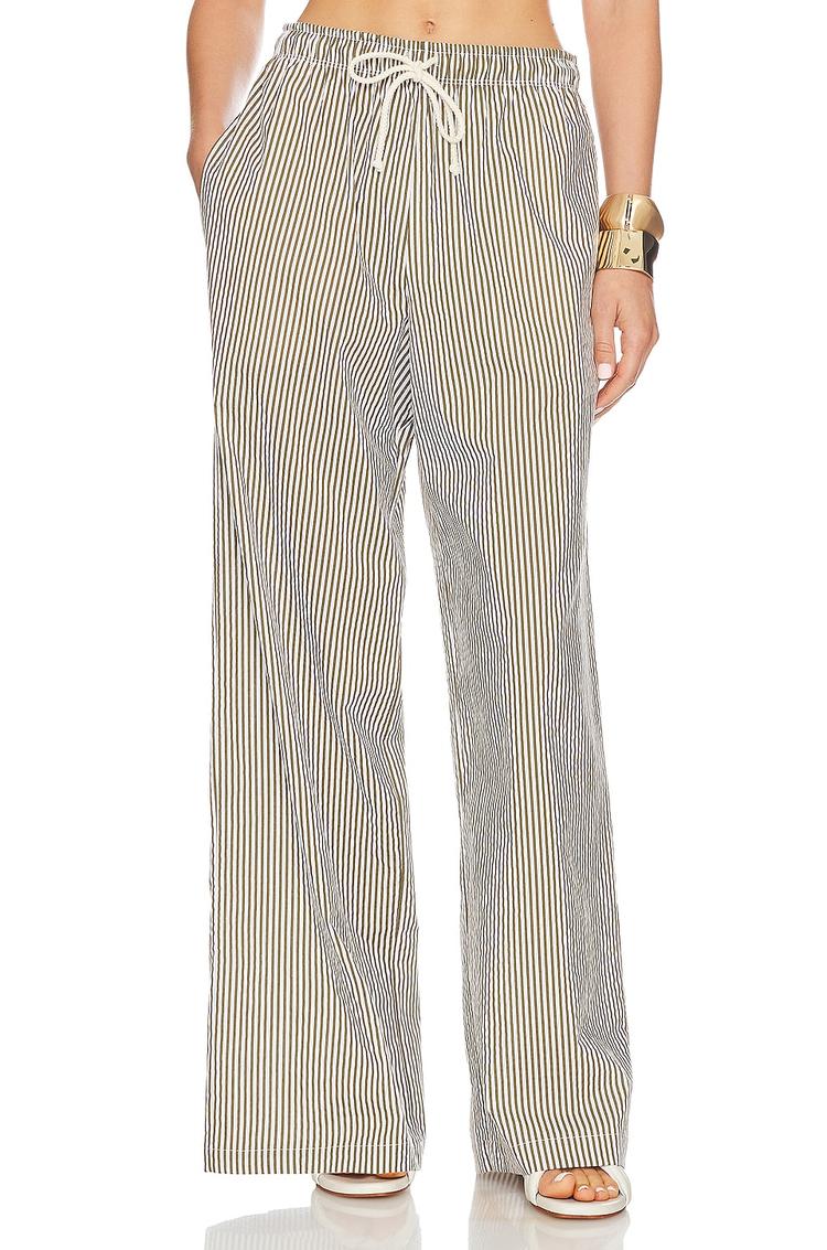 Meet a breezy essential for sun‑lit days and easy evenings: the Donni Tie Pant in pale striped cotton poplin. This pull‑on style sits at a comfortable mid rise with an elastic waist and a slim drawstring tie, draping into a relaxed, wide‑leg silhouette that moves with ease. Soft, breathable cotton keeps you cool, while slant pockets add practical texture to the lightweight fabric. Versatile for vacation days, casual brunch, or weekend errands, these striped pants pair best with a crisp tank or knit, sandals or espadrilles, and a sunlit smile. Effortless, polished, and endlessly wearable.