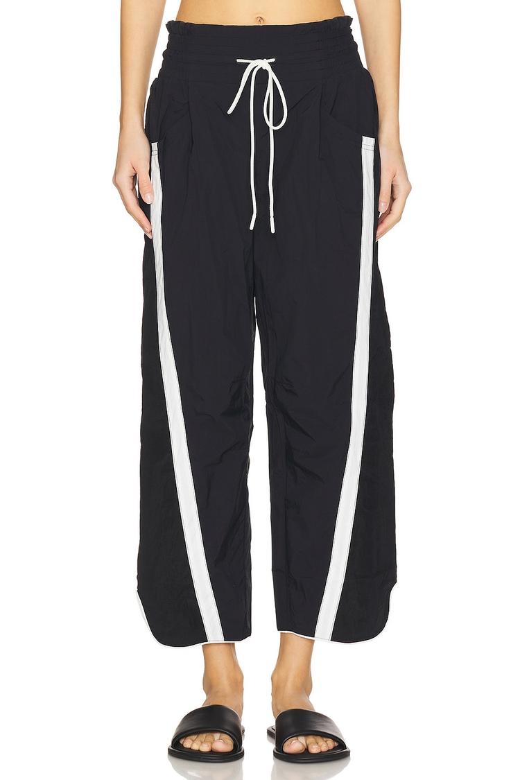 Confidently sporty and effortlessly chic, these Free People x FP Movement Champ Is Here Pant blend lightweight nylon with a statement side stripe. The cropped silhouette is pulled in at the cuff with a comfortable drawstring waistband, making them perfect for studio sessions, travel days, or laid-back weekend looks. Smooth on the outside, they feature slip pockets at the sides and back patch pockets for a practical touch. The bold white piping against deep black offers a modern, athletic vibe that pairs with a simple brami or oversized tee for versatile everyday styling.