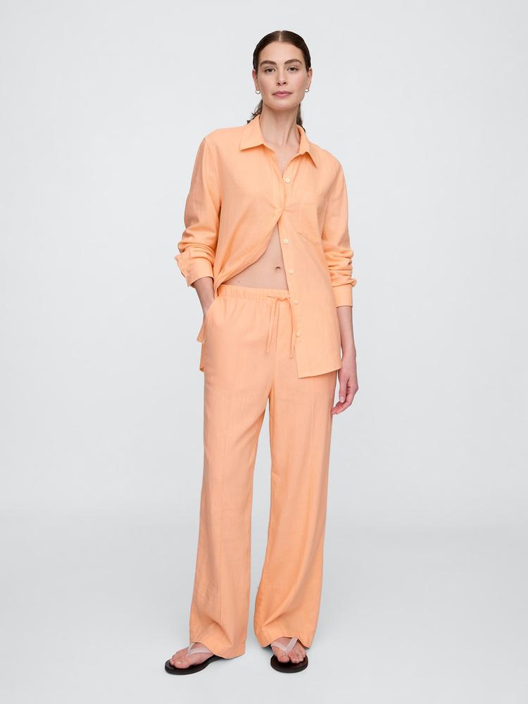 Elevate your everyday casual wear with these stunning linen-blend wide-leg pants that exude effortless style. Perfect for warm summer days, the lightweight, breathable fabric allows for all-day comfort while the drawstring waist ensures a flattering fit. Pair with a casual top for a chic look, or dress it up for brunch with friends. The soft, pale orange hue adds a touch of warmth to your wardrobe, making these pants a versatile staple for any occasion. Discover stylish sophistication while savoring delightful comfort.