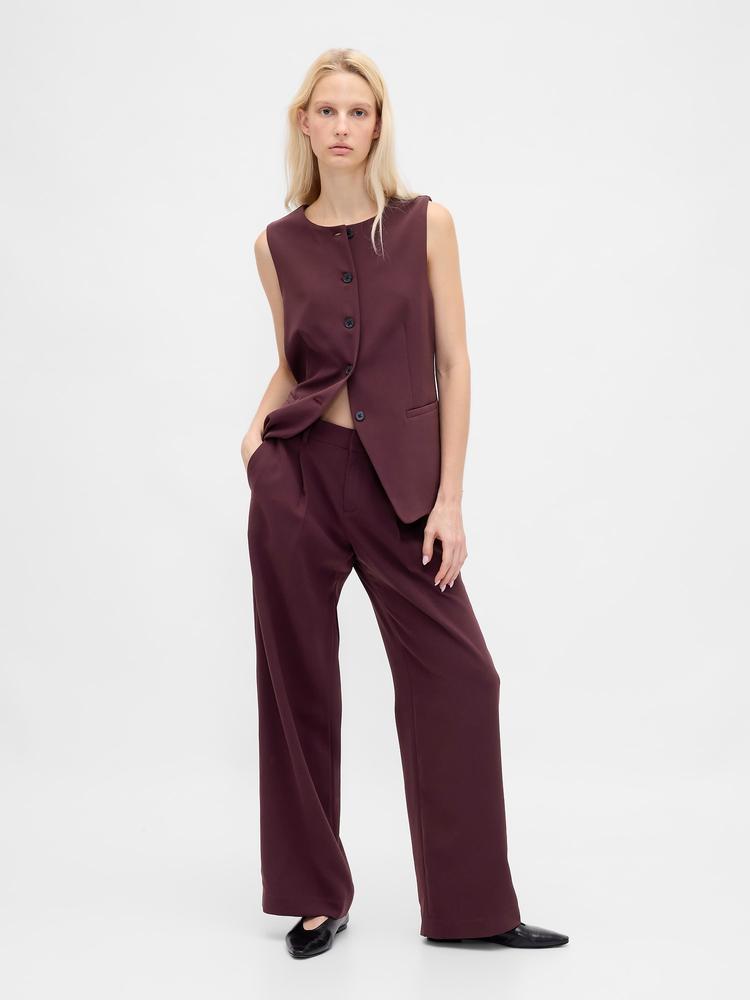 Step into effortless elegance with our 365 Low Rise Pleated Wide-Leg Trousers. Crafted from a luxurious blend of wool and polyester, these trousers boast a relaxed fit and elegant pleats that create flow with every movement. The rich wine color adds a sophisticated touch, making them perfect for any occasion. Pair them with a sleek top for brunch outings or create a chic travel ensemble. Elevate your everyday wardrobe and embrace style that speaks sophistication and comfort.