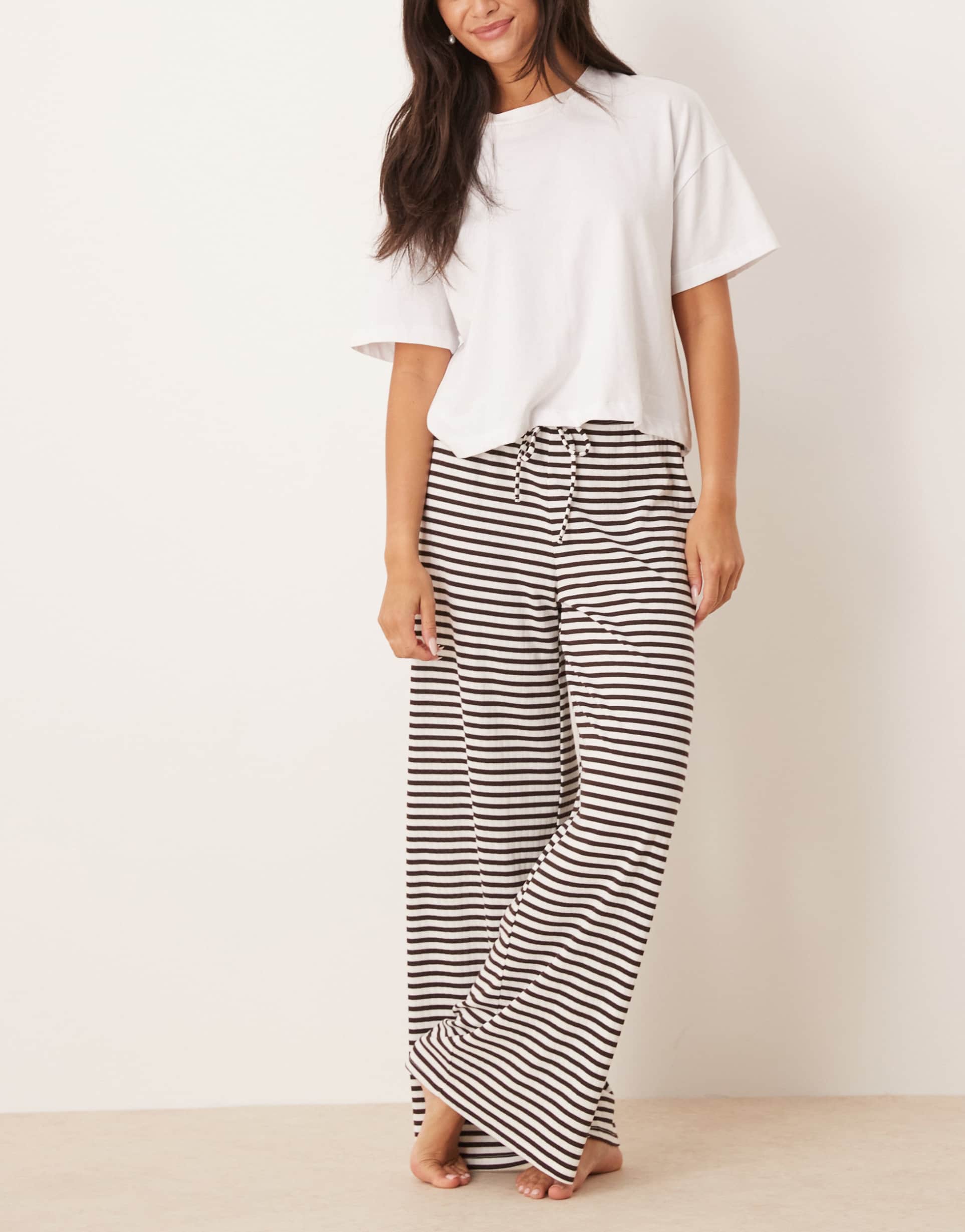 GINA TRICOT SUPERSOFT JERSEY WIDE LEG PANTS WITH DRAWSTRING WAIST IN WHITE BROWN STRIPE