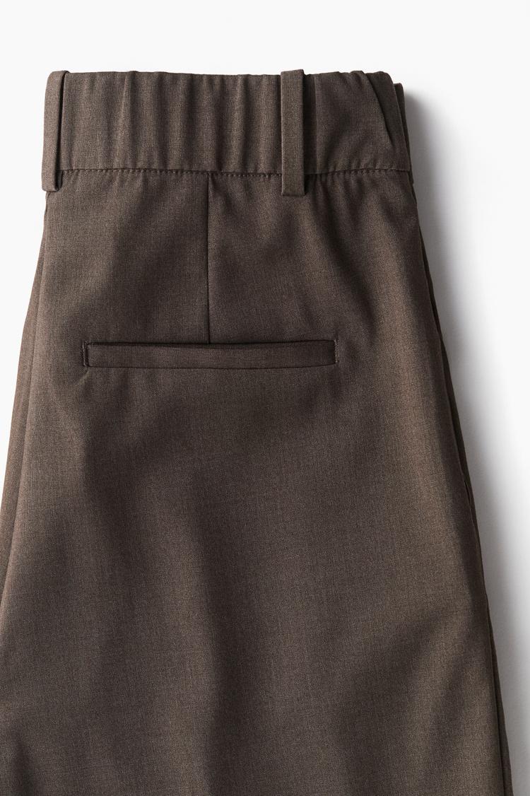 Sleek, ankle-length chinos in a cotton-poly blend that fuse smart structure with wearable ease. A high-rise waist sits neatly with front pleats while a covered elastic back ensures all‑day comfort. The zip fly with a hook‑and‑eye keeps the front smooth, and practical side pockets plus mock back pockets add everyday utility. The wide, gently tapered legs with crisp creases deliver a polished, office-ready silhouette that moves from meetings to after‑hours with effortless poise. A versatile olive-brown staple that anchors smart-casual looks with refined ease.