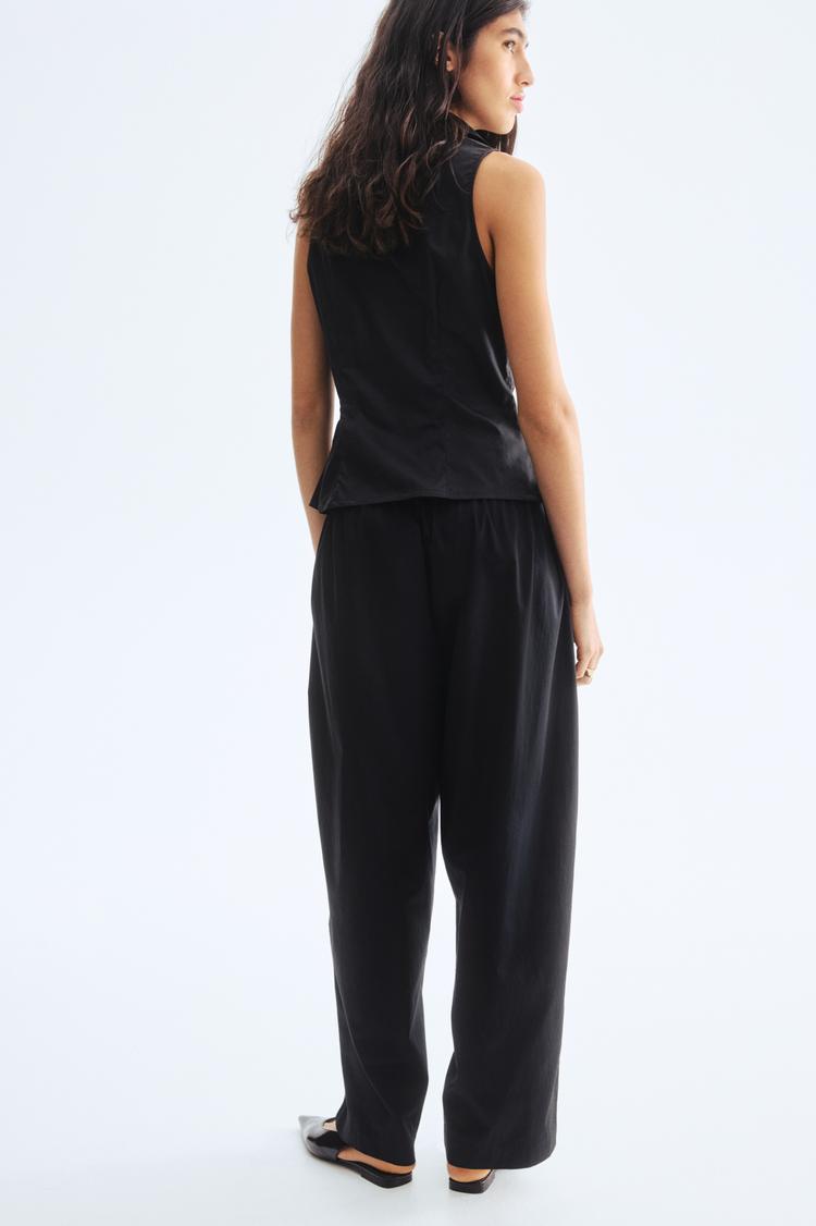 Embrace relaxed sophistication with these ankle-length pull-on pants in classic black. Crafted from lightweight, breathable cotton, they offer all-day comfort with a loose fit that flows effortlessly. The elasticated waistband ensures easy wear and a flattering regular rise, while the straight-leg silhouette and clean hemline create a timeless, minimalist look. Perfect for casual outings, lounging at home, or everyday errands, these versatile pants combine ease and style seamlessly. Elevate your basics with this essential staple that pairs effortlessly with your favorite tops for a chic, understated aesthetic.