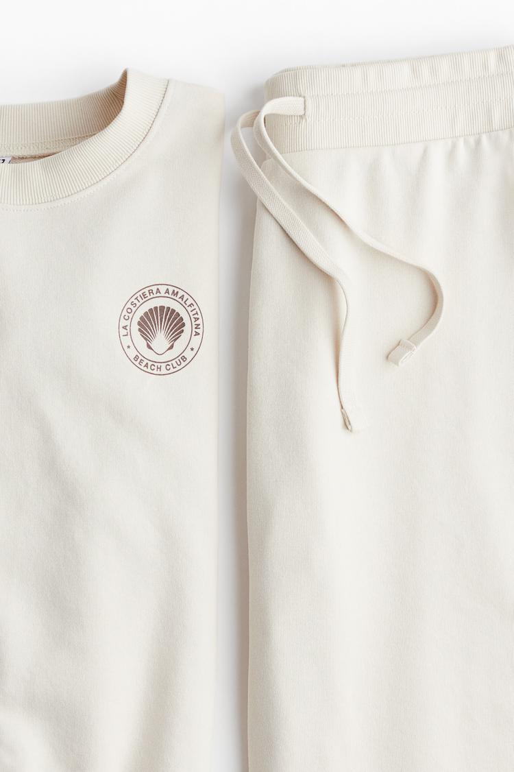 Embrace everyday ease with this ivory two-piece sweatsuit, crafted in a lightweight cotton-poly blend for breathable comfort from morning chores to leisurely weekends. The relaxed sweatshirt features a round neckline, dropped shoulders, and ribbed cuffs and hem, finished with a small circular embroidery patch for subtle branding. Pair it with the straight-leg joggers that sit at a mid waist with an elasticized drawstring waistband for a clean, streamlined silhouette. The monochrome set works anywhere—lounge at home, run quick errands, or cozy up for casual brunch. Effortless, soft, and sculpted with just enough structure to feel polished.
