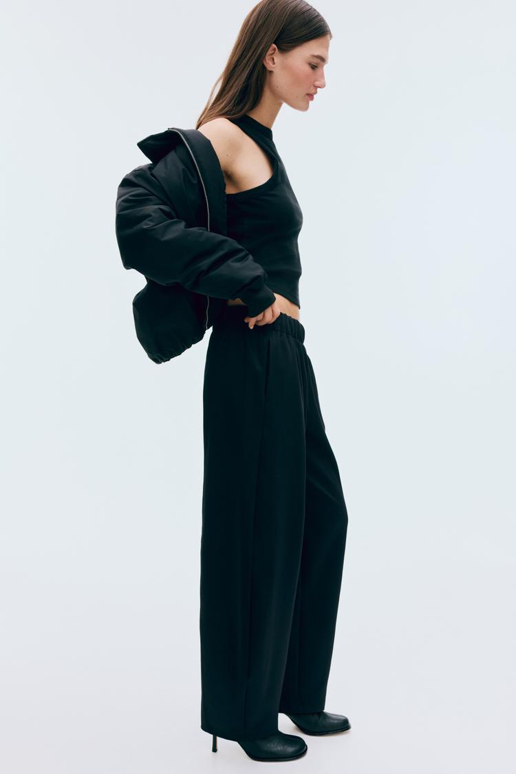 Embrace effortless style and comfort with these black barrel-leg ponte pants, designed for a relaxed yet polished silhouette. Crafted from a stretchable, soft-touch ponte fabric blend of polyester, viscose, and elastane, these pants feature a regular waist rise with an elasticated waistband for easy wear. Their wide-leg cut flows gracefully to a clean hemline, making them perfect for casual streetwear or minimalist everyday looks. Versatile and chic, these pants transition seamlessly from laid-back days to more refined casual settings, offering both comfort and modern sophistication in one staple piece.