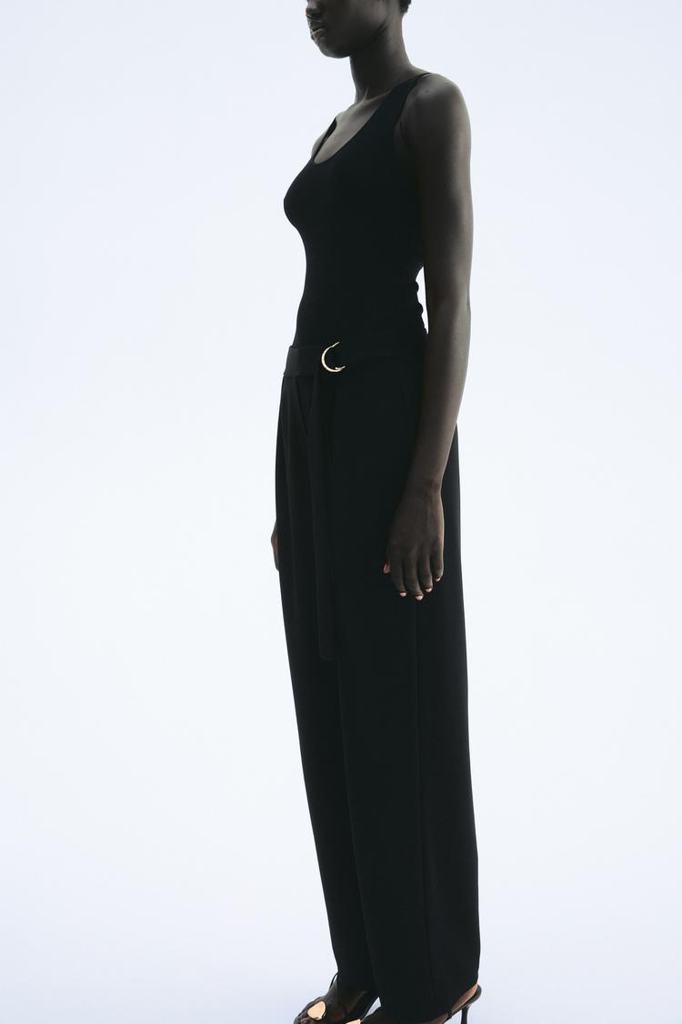 Effortless polish meets everyday ease in these belted jersey dress pants. A high-waist silhouette flatters with crisp front pleats that skim into a tapered leg, while the soft-stretch jersey keeps movement comfortable from desk to dinner. An attached belt with subtle D-ring hardware accents the waist and a concealed elastic waistband ensures a smooth, secure fit. The mock fly and cleanly tailored lines create a refined, workwear‑ready look you can dress up with a blazer or dial down with a tee. In black polyester jersey, they’re endlessly versatile for year‑round styling.