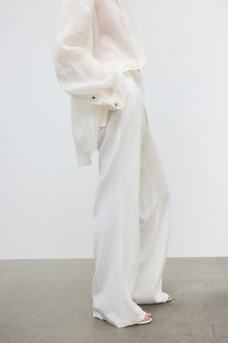 Elevate your everyday with these Bootcut Linen-Blend Pants. Crafted from an airy linen and viscose blend, they flow into a flattering bootcut silhouette with a crisp, tailored drape. A high waist sits cleanly beneath a concealed elastic waistband, while a zip fly with hidden button and hook-and-bar closures keeps the front streamlined. Diagonal side pockets and mock back pockets add practical polish, finished by pressed creases running through the front and back. In pure white, they pair effortlessly with a relaxed blouse for work or a sunlit tee for weekend getaways.