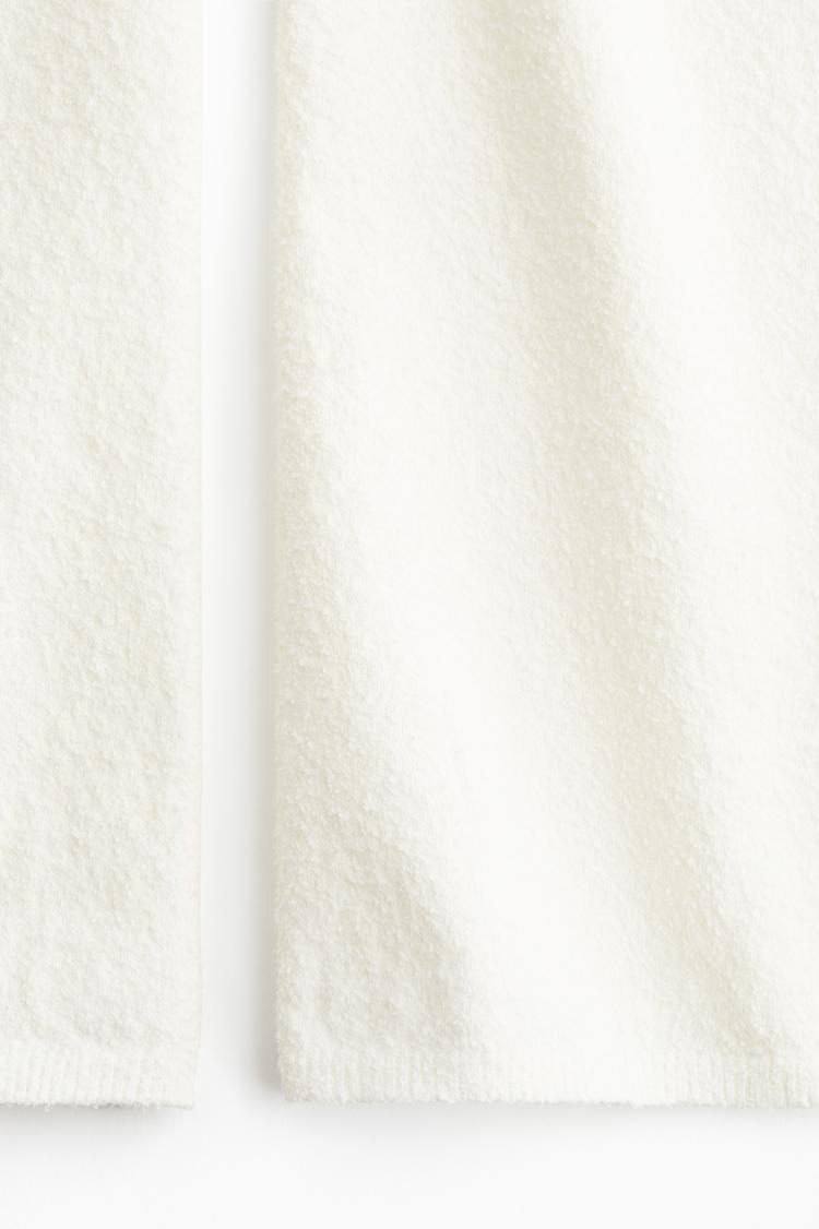 Embrace cozy elegance with these off-white bouclé-knit pants, designed for relaxed, effortless style. Crafted from soft and lightweight bouclé fabric, they feature a wide-leg silhouette and a comfortable elasticated waistband for easy pull-on wear. The full-length hemline with clean finishing adds a minimalist touch, making these pants perfect for casual and loungewear occasions during cooler seasons. Whether paired with a chunky knit or a simple tee, these pants bring understated sophistication and all-day comfort to your wardrobe.