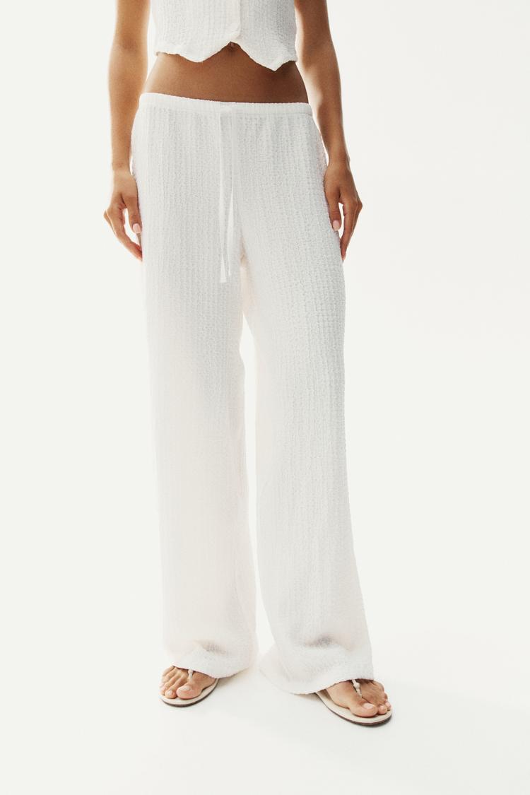Effortless comfort meets coastal polish in these crinkled white jersey Palazzo pants. A mid-rise waist with a drawstring and covered elastic delivers an adjustable, secure fit, while the soft cotton jersey drapes into a relaxed, full-length silhouette with a clean hem. The all‑white tone keeps styling versatile, pairing effortlessly with crop tops, tanks, or knits for casual days, travel, or vacation outings. Lightweight and breathable, these pants layer easily over sandals or sneakers, offering a minimalist yet polished staple that moves from day to night with ease.