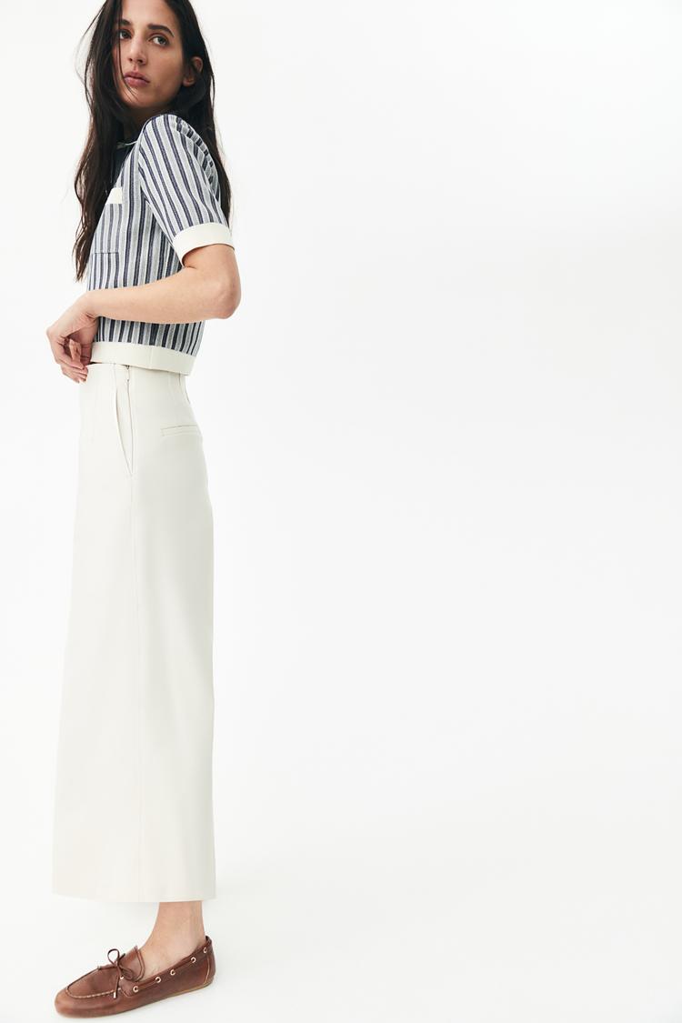 Effortless sophistication meets everyday practicality with these ivory culottes. Crafted in a breathable cotton weave, they sit high at the waist with darts that shape without restricting movement. A concealed side zipper and an elasticated waistband ensure a smooth, comfortable fit, while diagonal side pockets and mock welt back pockets add functional flair. The wide, 3/4-length legs create a clean, modern silhouette with crisp front and back creases for a polished look. Pair with a striped tee or a crisp blouse for work, brunch, or weekend travel—versatile enough to elevate any destination.