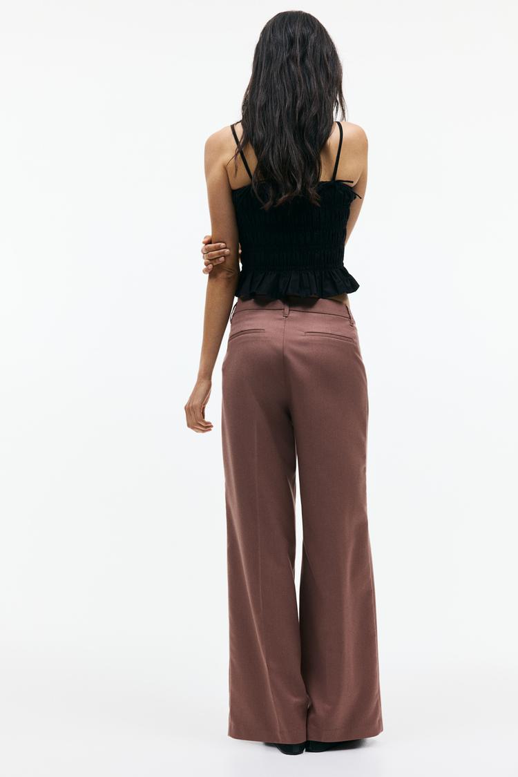 Polished and versatile, these twill dress pants in a rich brown bring a refined ease to every day. The loose, wide-leg silhouette flows with movement, while pleats at the top add subtle structure. An extended waistband tab with a concealed hook-and-eye closure and a zip fly guards a smooth front, complemented by diagonal side pockets and mock welt back pockets. Crafted from a cotton-polyester blend in a classic twill, they crease crisply for a polished desk-to-dinner look. Pair with a silk blouse or structured blazer for workwear that transitions seamlessly to evenings out.