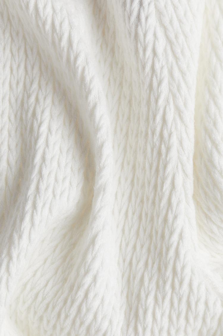Effortless comfort meets luxe texture with these Flared Cable-Knit-Look Pants. Crafted from soft cotton jersey, they drape in a relaxed yet flattering silhouette, with a high, smooth waist and an elasticated band for all‑day ease. The leg opens into a generous flare, delivering movement and a retro‑inspired vibe that feels polished yet cozy. The cable-knit appearance adds tactile depth, while the pristine white hue brightens any top. Pair with a chunky knit or a sleek blouse, finished with ankle boots or sandals for an adaptable, season‑spanning wardrobe staple.