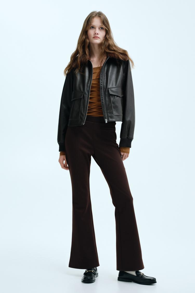 Embrace sleek sophistication with these matte dark brown flared pants, tailored to deliver a slim-fit silhouette that elongates your legs with a classic full-length cut. Crafted from a smooth woven fabric, these pants feature a regular waist rise and a clean, flat-front waistband that offers a polished, minimalist aesthetic. Perfect for casual everyday wear or layering under stylish outerwear, they bring effortless modernity to your wardrobe. The clean hemline and subtle flare add a timeless touch, making these pants a versatile staple that seamlessly transitions from day to night with ease and grace.