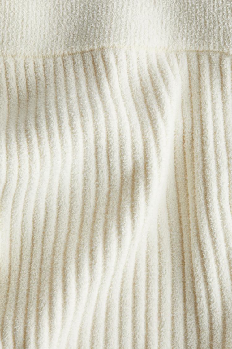 Embrace cozy sophistication with these flared rib-knit pants in a soft off-white hue. Crafted from a stretchable knit fabric, these pants feature a comfortable elasticated waistband and a mid-rise fit that flatters your silhouette. The full-length flared legs add a modern, minimalist touch, perfect for casual days at home or stylish outings. The subtle ribbed texture enhances the tactile appeal, making these pants a versatile staple for autumn, winter, and spring wardrobes. Pair them effortlessly with your favorite tops for an understated, chic look that blends comfort with contemporary style.