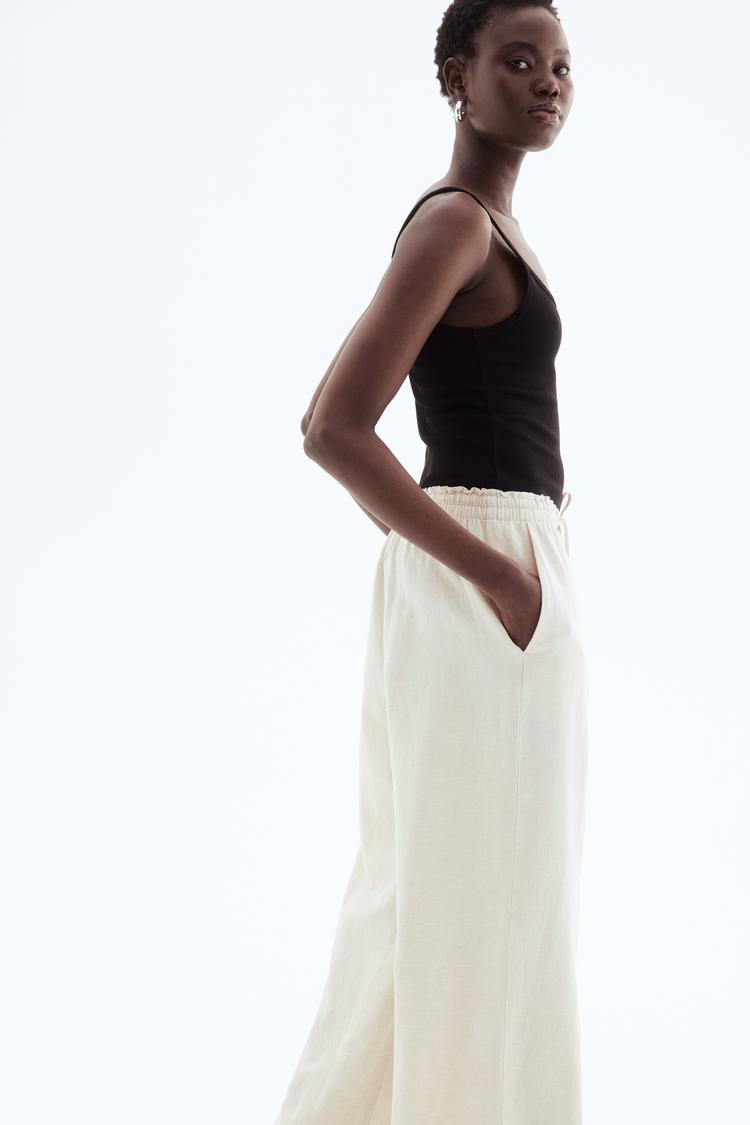 Loose-fit, ankle-length pants in an airy, woven linen blend. High waist and waistband with small ruffle trim, narrow drawstring, and smocked elastic. Diagonal side pockets and wide legs.