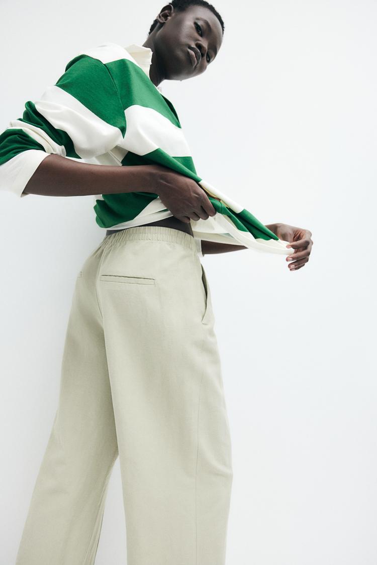 Effortlessly refined in a breathable linen blend, these high‑waist pants move with you from busy workdays to relaxed weekend outings. The relaxed wide leg falls into a clean crease, while an elasticated waistband keeps you comfortable all day. Diagonal side pockets and welt back pockets bring practical utility to a minimalist silhouette, finished in a soft beige that pairs with everything. A versatile staple for spring and summer, these pants transition from office to travel with ease, delivering timeless, everyday polish and warm‑weather ease.