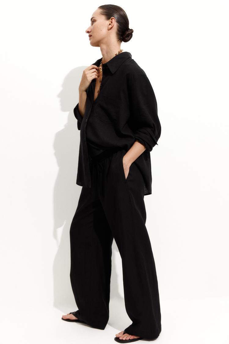 Loose-fit pants in an airy, woven linen and viscose blend. Low waist and waistband with covered elastic and a narrow drawstring for added comfort during and after pregnancy. Discreet side pockets and wide legs.