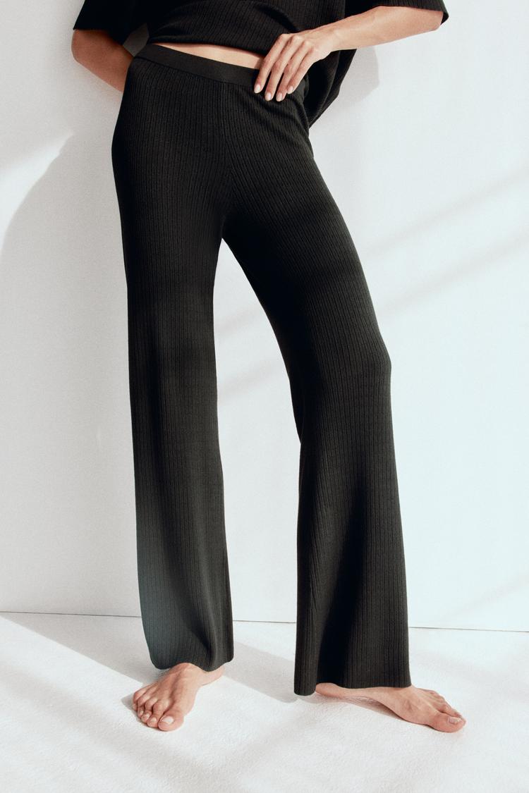 Embrace relaxed elegance with these black pointelle-knit wide-leg pants, crafted for effortless comfort and breathable wear. Featuring a mid-rise elasticated waistband and a flowing full-length silhouette, they drape beautifully for a minimalist yet chic look. The soft, lightweight knit fabric highlights subtle pointelle detailing, adding texture without overwhelming simplicity. Perfect for casual days, lounging at home, or travel, these versatile pants blend comfort with understated style, making them a must-have staple in any capsule wardrobe.