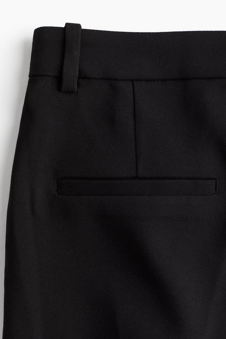 Sharp, ankle-length tapered dress pants in a dark black woven fabric, engineered in a polyester-cotton blend for a polished silhouette. High-rise waist with a clean zip fly and button closure, belt loops visible, cuffed slim leg that travels from the hip to a refined break at the ankle. Diagonal side pockets add practical ease, paired with mock welt back pockets for a streamlined profile. Front-creased stitching and back-pressed creases create a crisp, tailored look that transitions from boardroom to after-hours. Style with a crisp blouse and blazer for a timeless workwear ensemble.