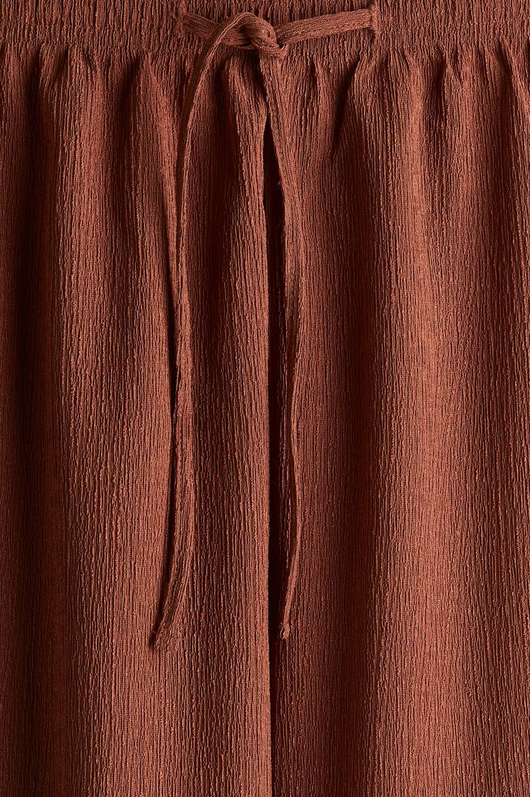 Effortless, breathable ease defines these textured jersey pants. The high‑rise silhouette sits snug at the waist with a covered elastic waistband and a slim drawstring for a customizable fit. A relaxed, wide leg creates fluid movement and a modern, laid‑back vibe. In a rich rust terracotta, the textured knit adds depth and warmth to any top—from crisp white shirts to soft knits. Perfect for casual days, home offices, and weekend getaways, these pants pair with sandals, flats, or heels for a look that transitions from brunch to travel with quiet confidence.