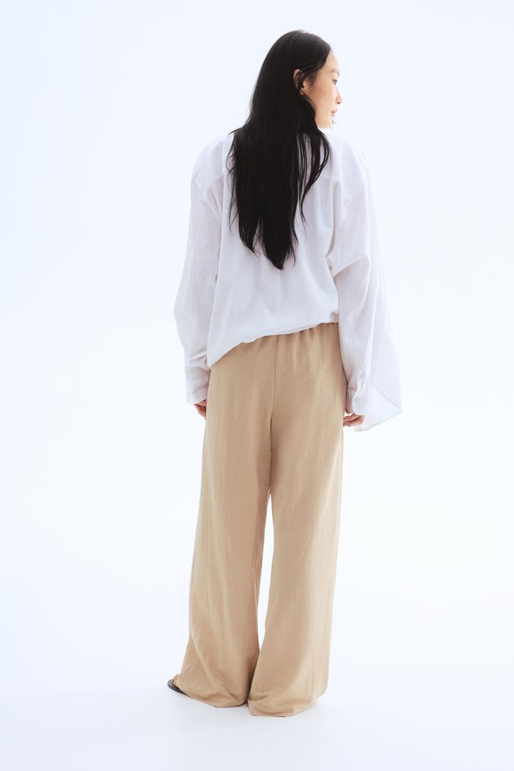 Effortless ease meets refined drape with these wide-cut pull-on pants. Crafted in soft jersey, they glide over the body with a relaxed, high-rise silhouette and a forgiving elasticized drawstring waistband that defines the shape without fuss. The neutral beige hue and fluid wide legs create a calm, versatile base for everyday outfits. Pair with a crisp white blouse for brunch, a knit top for cool days, or a flowy tunic for travel days. Lightweight and comfortable, they transition from lounging at home to sunny city strolls with effortless, polished ease.