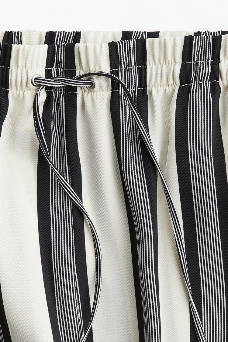 Elevate your everyday with these wide‑leg drawstring pants. Crafted in a cotton‑linen twill with a subtle sheen, they sit high at the waist for a flattering, elongated silhouette. The elasticated waistband with a slim drawstring offers effortless comfort, while diagonal side pockets add practical, low‑key utility. The bold black‑and‑white striped pattern creates a chic, leg‑lengthening effect that works from desk to dinner. Pair with a crisp blouse for office polish or a relaxed tee for weekend ease—these versatile pants redefine casual with a refined, modern edge.