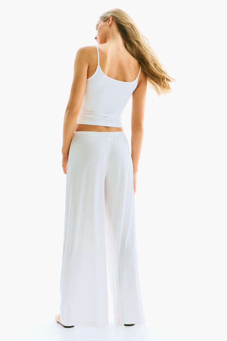 Effortlessly chic and supremely comfortable, these wide-leg pants bring a clean, minimalist vibe to everyday outfits. Crafted in soft ribbed viscose jersey, the drape is fluid and flattering, while the drawstring with an elastic waistband ensures a flexible, stay-put fit. The crisp white hue keeps the look fresh and versatile, easy to pair with a crop top, tank, or cropped cardigan. The relaxed silhouette flatters with easy movement, making them ideal for lounge days, casual errands, or vacation mornings. Dress them up with sandals and a polished top, or keep it laid-back with sneakers for a modern, timeless appeal.