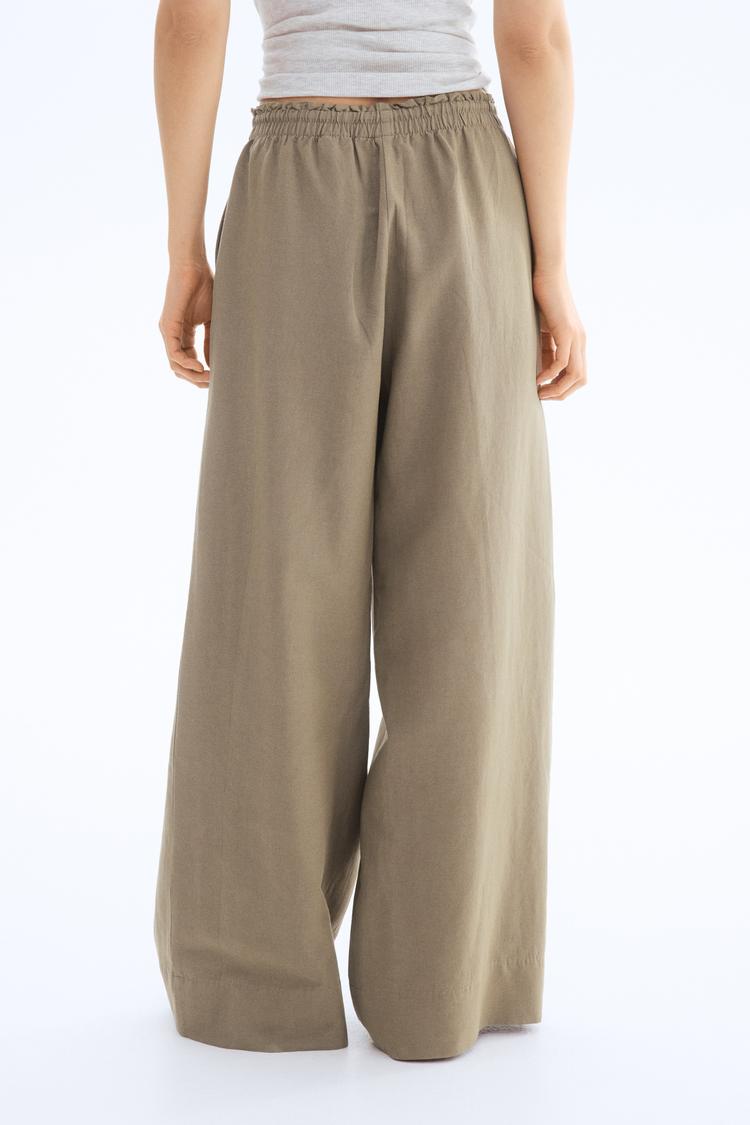 Effortless confidence meets warm-weather ease in these Wide Leg Linen-Blend Pants. Crafted in a breathable khaki linen blend, they sit at a flattering high waist with a narrow drawstring and a covered elastic waistband for a smooth, comfortable fit. The wide-leg silhouette drapes softly into full-length hems, while diagonal side pockets offer practical everyday utility. The neutral, versatile tone pairs with everything from a crisp white tank to a silky blouse, making them ideal for coffee runs, desk-to-dinner days, or vacation days spent wandering markets. Simplify your warm-weather wardrobe with this polished, breathable essential.