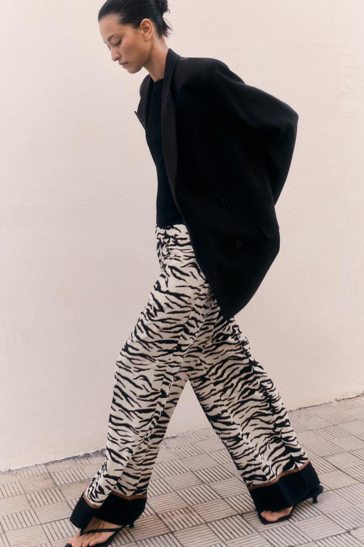 Meet an effortlessly bold essential for modern wardrobes: wide-leg pants cut high at the waist in a striking zebra print. Crafted from a breathable cotton-linen blend in an off-white ground with inky black stripes, these pants float over the body with a loose, comfortable silhouette. A back-elastic waistband ensures a smooth fit while a discreet side zipper with hook-and-eye keeps the lines clean. Front and back crease accents lend a tailored edge, and a black cuff at the hems anchors the look. Pair with a sleek top for brunch, travel days, or casual office moments.