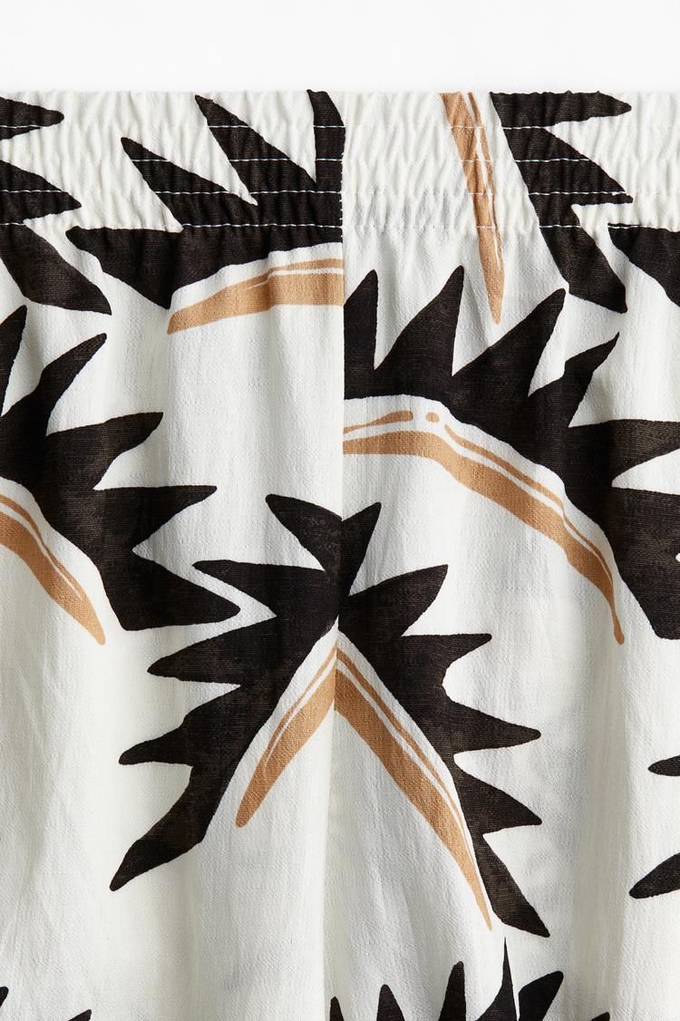 Effortless resort-ready style meets everyday ease in these wide-leg Palazzo pants from H&M. Crafted in breathable cotton with a high, pull-on elastic waistband for a smooth fit, they skim the hips before flowing into generous, full-length legs. The ivory-cream base is tastefully printed with bold black tropical palm motifs, creating a bohemian aesthetic that pairs beautifully with an off-shoulder white top. The discreet side pockets add practical charm. Ideal for sunny brunches, beach vacations, or city strolls, these pants bring breezy silhouette and polished calm to any warm-weather wardrobe.