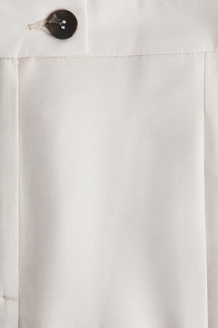 Effortless polish meets everyday ease in these Wide-Leg Twill Pants. In a soft cream tone, the high-waisted silhouette sits neatly under an extended waistband tab and button, while generous pleats release into fluid, wide legs that glide with every step. Crafted from a cotton-poly blend, the fabric balances breathability with durability, and front creases sharpen the tailored look. Practical side pockets and welt back pockets add everyday function without sacrificing polish. Pair them with a tucked blouse and blazer for a refined workday, or with a knit top and sandals for relaxed city weekends.