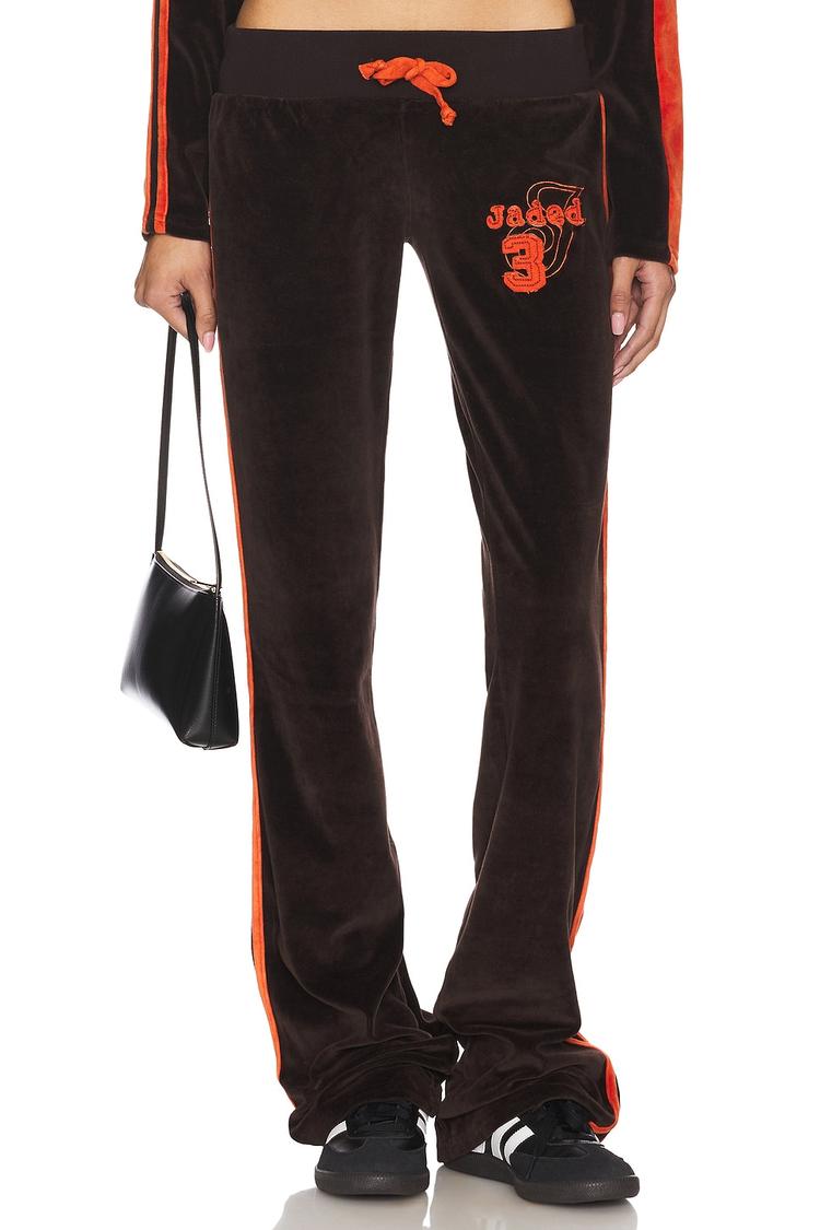 Ground your everyday looks with these Three Velour Trousers from Jaded London. In deep black velour, they glide with a relaxed, full-length silhouette and a smooth pull-on waist finished with a practical drawstring. A vivid orange piping races down the sides, echoing the embroidered logo at the thigh for a sporty-chic flash of personality. Crafted from a cotton-polyester blend for soft, plush comfort, these trousers pair easily with a cropped top or oversized hoodie for a laid-back, luxe vibe. Wear them for lounging at home, running errands, or low-key street style moments—effortless, versatile, and effortlessly cool.
