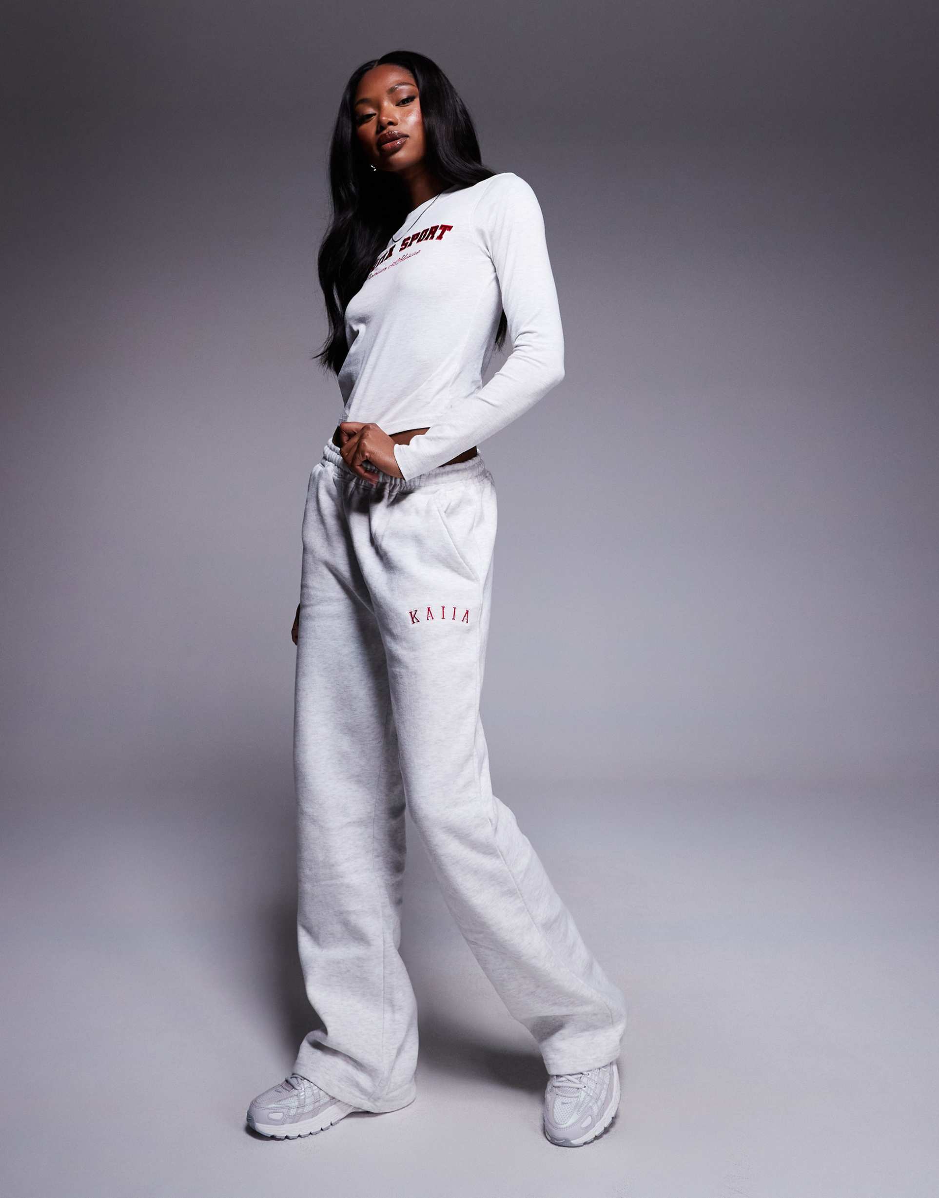 KAIIA EMBROIDERED LOGO WIDE LEG SWEATPANTS IN LIGHT GRAY HEATHER AND RED - PART OF A SET