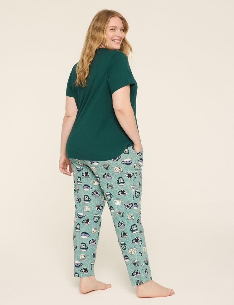 Cozy up in this Comfy Cotton Tee & Pant PJ Set from Lane Bryant. The top is a soft, breathable forest-green cotton blend with a curved-hem tee for easy drape, while the light-mint printed pants bring playful graphic motifs through a front-to-back all‑over pattern. The pants feature a covered elastic waistband for a relaxed, comfortable fit and practical pockets for late-night essentials. Designed for lounge-worthy evenings, movie marathons, and effortless sleepwear style, this two-piece set blends everyday comfort with a touch of whimsy—your go-to bedtime companion for relaxed, chic downtime.