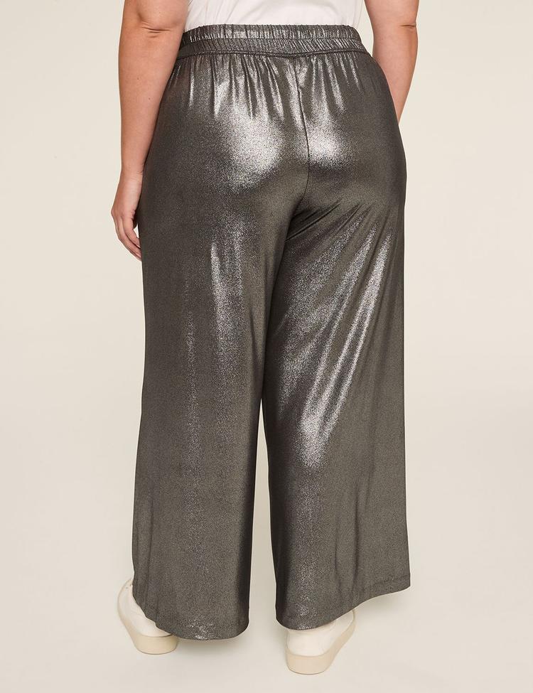Elevate your everyday with a touch of glamour. These plus-size foil shimmer matte jersey pull-on pants fuse comfort and confidence in a high-rise, elasticated waist with a drawstring for custom tummy coverage. The wide, draped leg falls fluidly from hip to hem, creating a relaxed silhouette that moves with you. Crafted in luxe matte jersey with a subtle foil shimmer, they feature practical pockets and a soft, stretchable feel that holds its shape from morning meetings to evening outings. Dress them up with a silky blouse or keep it casual with a sweater—effortless polish, anywhere you go.