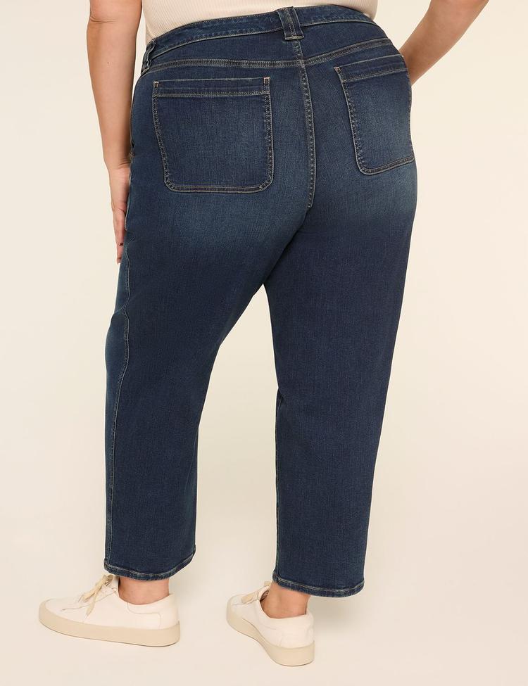 Experience the perfect blend of comfort and style with these high-rise ankle jeans designed especially for curves. Crafted from premium comfort stretch denim, they feature a no-gap, flex magic waistband that moves with you for all-day ease. The straight-leg silhouette hits gracefully at the ankle, offering a flattering and versatile fit. Classic dark denim with clean hemlines and strategically placed patch pockets at the back provide a subtle lift and timeless appeal. Ideal for casual outings, workwear, or travel, these jeans are a must-have staple that effortlessly complements your everyday wardrobe.