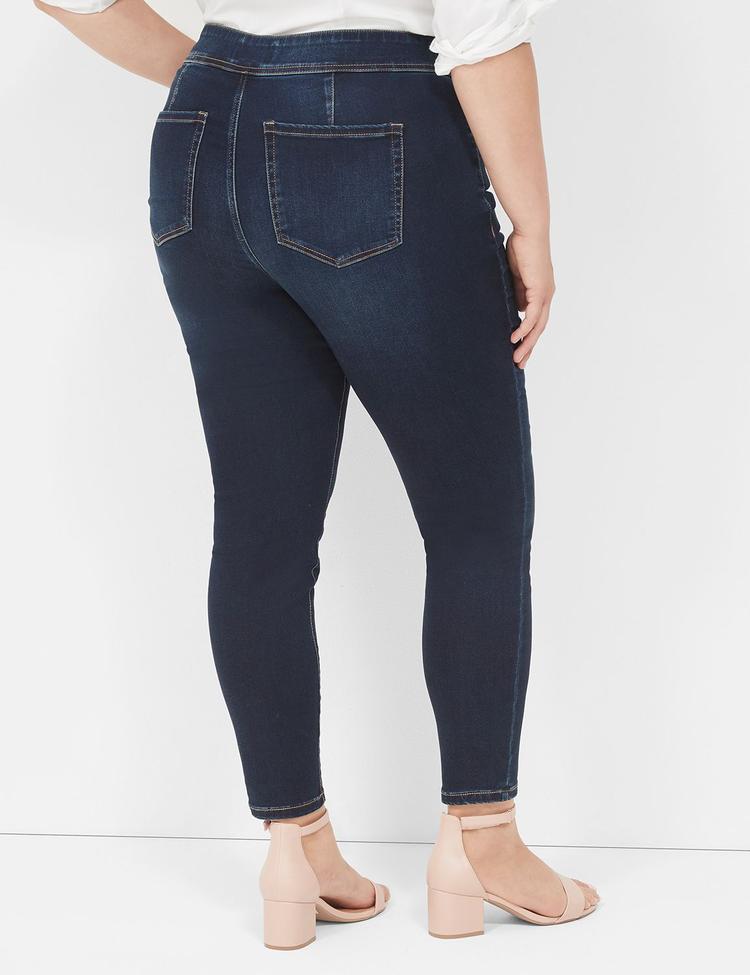 Experience the perfect blend of style and comfort with these Knockout High-Rise Sateen Jeggings by Lane Bryant. Crafted in a dark blue denim-inspired sateen fabric, these plus-size jeggings feature a flattering high-rise belted waistband with a corset-like fit and a seamed yoke that highlights your silhouette beautifully. The super-slim, ankle-length skinny fit hugs from hip to hem, delivering a sleek and polished look that pairs effortlessly with casual or workwear ensembles. Subtle whiskering and fading add a touch of classic denim character while the triple-button and zip fly closure ensures a secure fit. Designed for all-day comfort with stretchable, soft-touch fabric, these jeggings are a versatile staple for everyday wear and beyond.