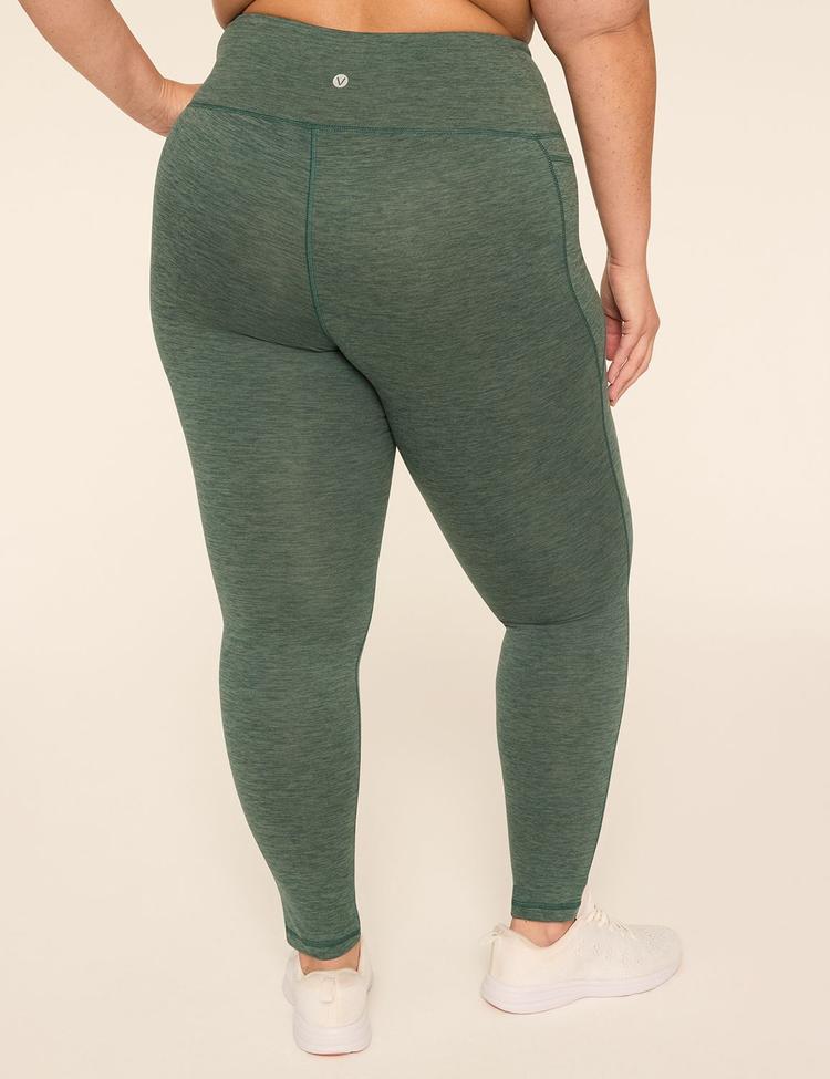 Experience the perfect blend of comfort and style with these LIVI High-Rise 7/8 leggings in a muted pine green shade. Crafted from buttery-soft, lightweight fabric with 4-way stretch, they offer a fitted silhouette that hugs from the hips to just above the ankle. The high-rise flat-front waistband ensures tummy coverage and stays comfortably in place without digging in. Practical streamlined pockets on each thigh add a functional touch, making these leggings ideal for early morning stretches, casual walks, or relaxing at home. Designed especially for curves, they deliver versatile wearability for everyday activities with an effortlessly chic, sporty vibe.