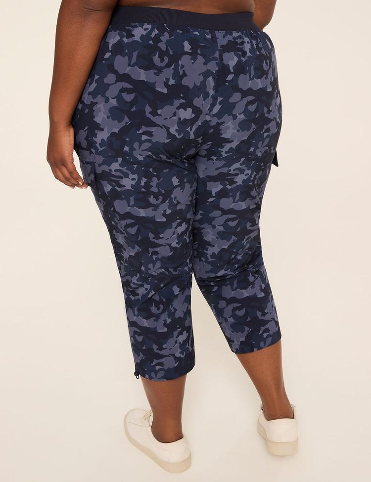 Embrace effortless movement and customizable comfort with the LIVI Mid Rise Woven Crop pants. Featuring a sleek dark blue camouflage pattern in a smooth woven polyester-spandex blend, these plus-size crop pants offer a relaxed fit that tapers gently from knee to mid-calf. The standout ruched hem allows you to adjust the length and fit to your preference, while the ribbed elastic waistband with drawstring ensures secure wear. Functional front and cargo pockets add utility, making these pants perfect for casual outings, workouts, or travel. Designed for versatility and style, these activewear crops blend fashion and function for your everyday sporty chic look.