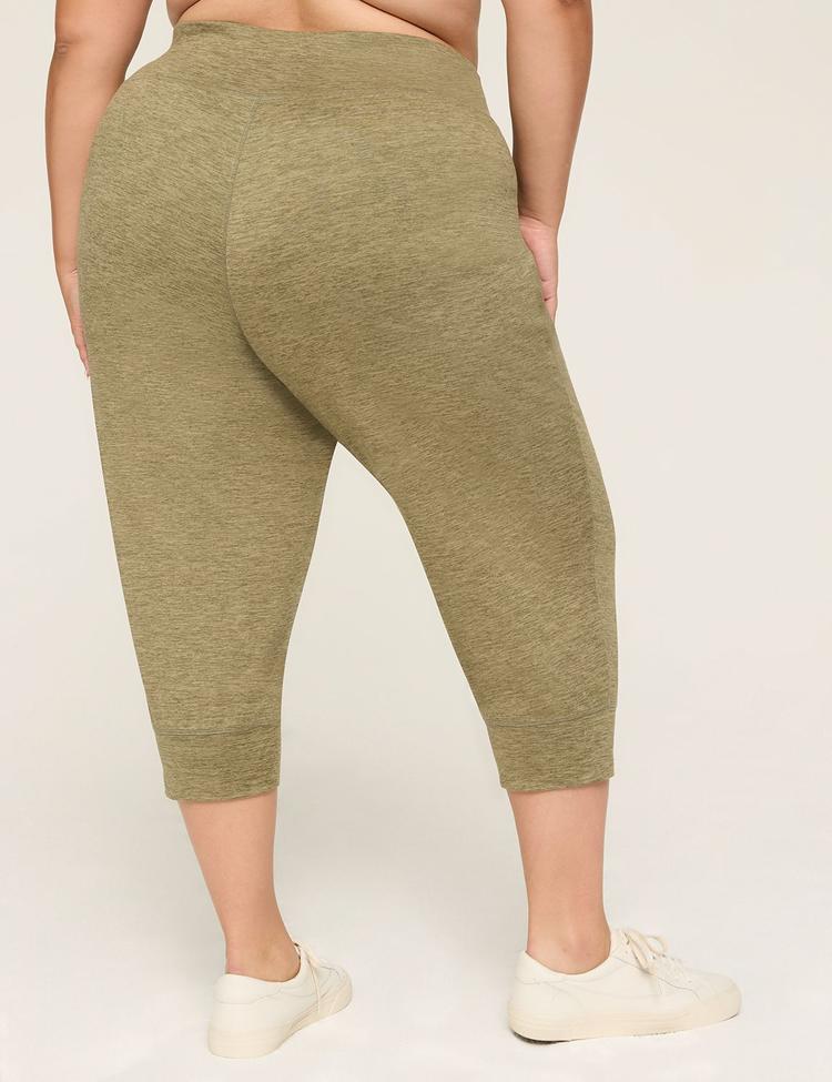 Embrace comfort and casual style with these Plus Size LIVI Soft Capri Joggers in a muted olive green hue. Crafted from Lane Bryant’s signature buttery-soft, eco-friendly fabric blend of recycled polyester and spandex, these joggers offer a relaxed fit from hip to knee that tapers into a cuffed hemline at the calf. The brushed texture inside and out enhances softness, while the covered elastic waistband ensures easy pull-on wear. Featuring practical front pockets and designed for all-day movement, these capri joggers seamlessly blend street-ready style with athleisure comfort. Perfect for casual outings or laid-back days, they are a versatile staple for your everyday wardrobe.