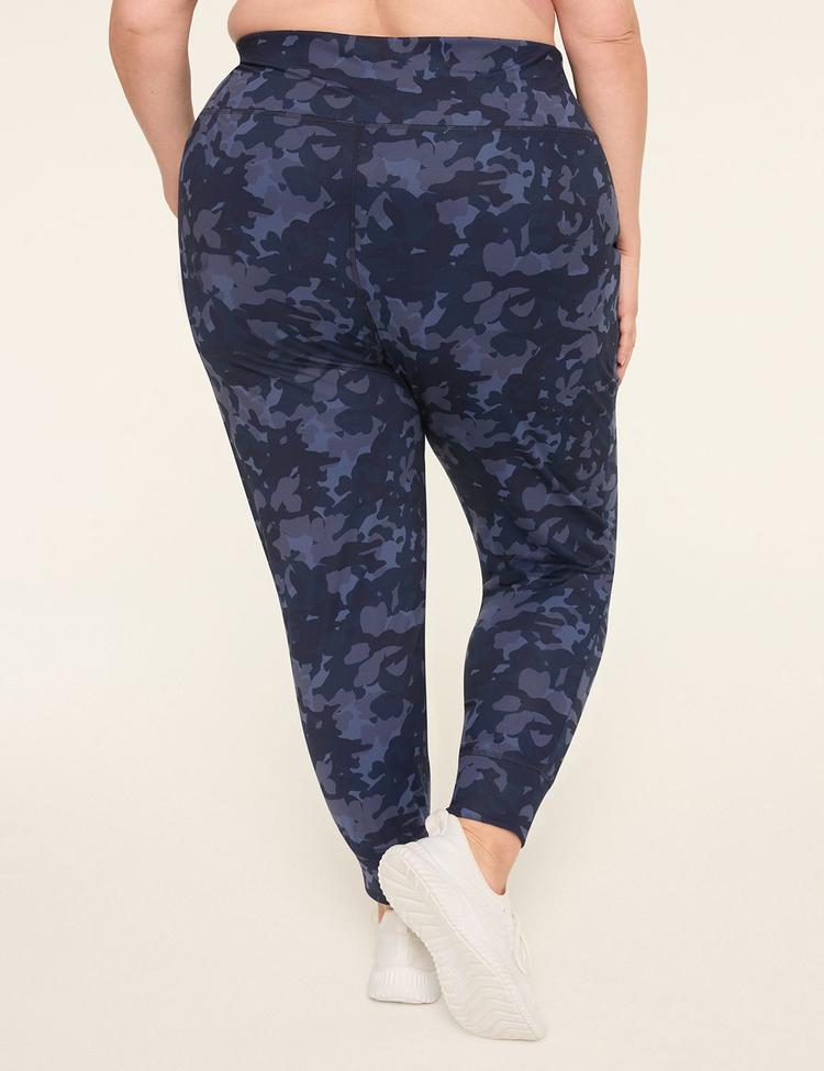 Experience the perfect blend of comfort and style with the LIVI Soft Jogger in a sleek navy camouflage print. Crafted from Lane Bryant's signature buttery-soft LIVI Soft fabric, these joggers offer 4-way stretch and a light-as-air feel that moves with you all day. Featuring a mid-rise elasticated waistband that lays flat for a smooth silhouette, relaxed fit through the hips tapering to gathered, cuffed ankles, these joggers are designed for both lounging and active moments. Two functional front pockets add practicality, making these plus-size joggers a versatile staple for casual wear, athleisure, or travel. Elevate your everyday wardrobe with effortless comfort and modern flair.
