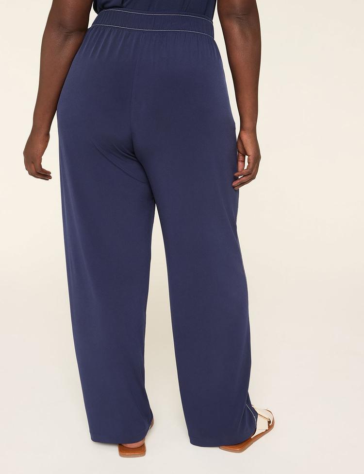 Effortlessly refined in maritime blue matte jersey, these pull-on wide-leg pants cloak you in smooth, forgiving comfort from morning meetings to evening errands. The mid-rise waist smooths and flatters, with a back elastic that moves with you, while the wide-leg silhouette creates a soft, elegant drape. Subtle stitch detailing runs along the front, accenting the relaxed-yet-polished look. Practical pockets add everyday utility without interrupting the line. Crafted in stretchy matte jersey, they glide through your day with a luxe feel and easy care. Pair with a tunic or a crisp blouse for a versatile, all-day staple.