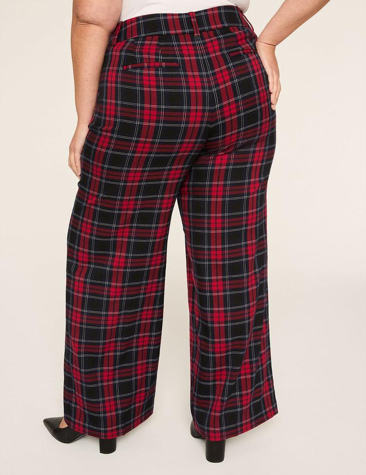 Step into everyday polish with these Plus Size Perfect Drape High-Rise Plaid Wide-Leg Pants. A high contoured waistband flatters the natural waist while preventing gaping, and the full-length wide-leg silhouette drapes with a refined, suit-like finish. Crafted from a smooth polyester-rayon-spandex blend, the plaid in bold red and black reads effortlessly chic from desk to dinner. Functional four pockets and a secure zip fly with inner button ensure practical wear, while the leg breaks into an easy, relaxed fit from hip to hem. Pair with a silky top for work, or a knit for weekend ease—versatility that never compromises style.