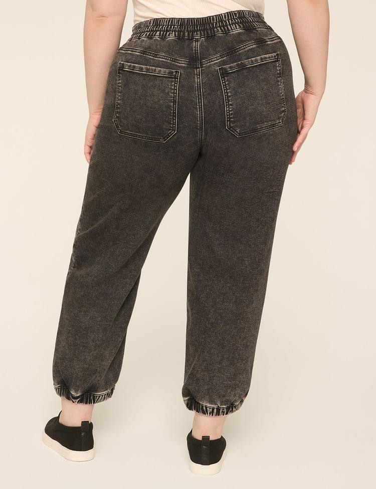 Effortless, curve-loving comfort meets everyday polish with these pull-on knit denim joggers in a rich black wash. Crafted from a lightweight, ultra-soft denim blend with stretch, they glide over curves from hip to ankle thanks to a mid-rise, covered elastic waistband with a drawstring. The relaxed hip through knee tapers to a gathered, cuffed ankle for that modern jogger silhouette. Two front pockets and two back pockets keep essentials close. Versatile enough for casual weekends with a plaid shirt and sneakers, or dressed up with a blouse and flats for easy errands and beyond.