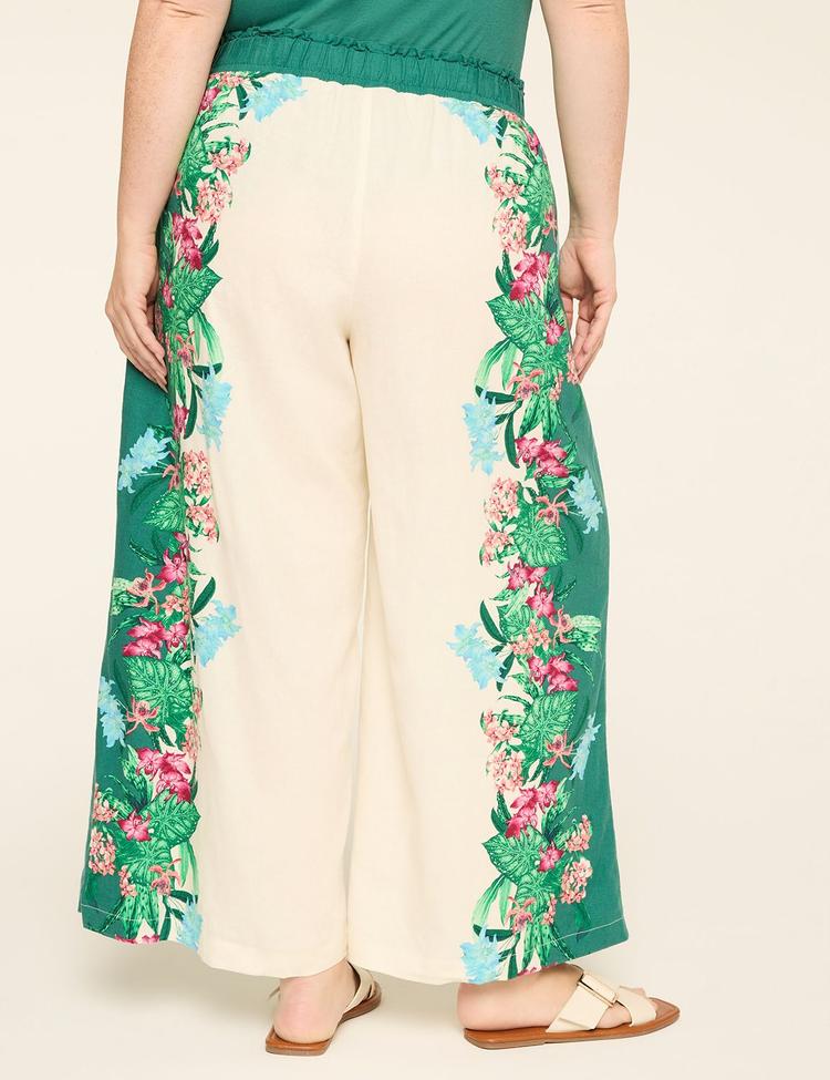 Bring effortless vacation vibes to your wardrobe with these Plus Size Wide Leg Paper Bag Waist Pants. Crafted from a breathable linen-viscose blend, they feature a flattering paperbag waistband with elastic for comfort and a relaxed fit through the hips and legs. The full-length silhouette is enhanced by vibrant floral panels along the sides in lush greens, pinks, and blues against a creamy base, adding a playful yet sophisticated touch. Perfect for spring through autumn, these pants easily transition from casual outings to travel adventures, offering both style and ease. Embrace relaxed elegance and standout tropical charm wherever you go.